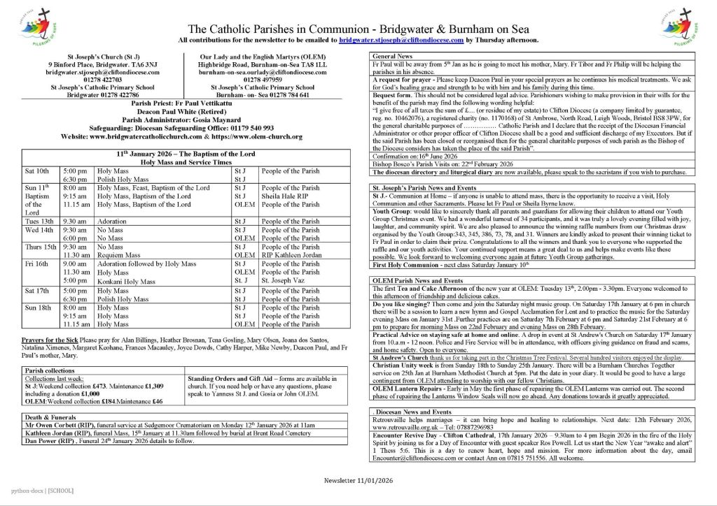 Newsletter St J = St Joseph’s, Bridgwater OLEM = Our Lady of the English Martyrs, Burnham 11.01.26 (Baptism of the Lord)Download Share this: Click to share on X (Opens in new window) X Click to share on Facebook (Opens in new window) Facebook Like Loading...